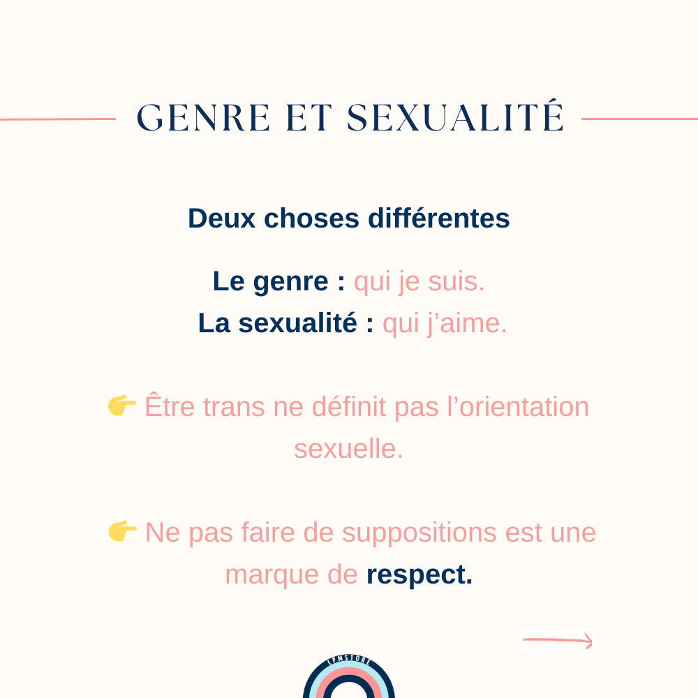 Une personne trans peut être hétéro, gay, bi, pan, asexuelle, ou autre.