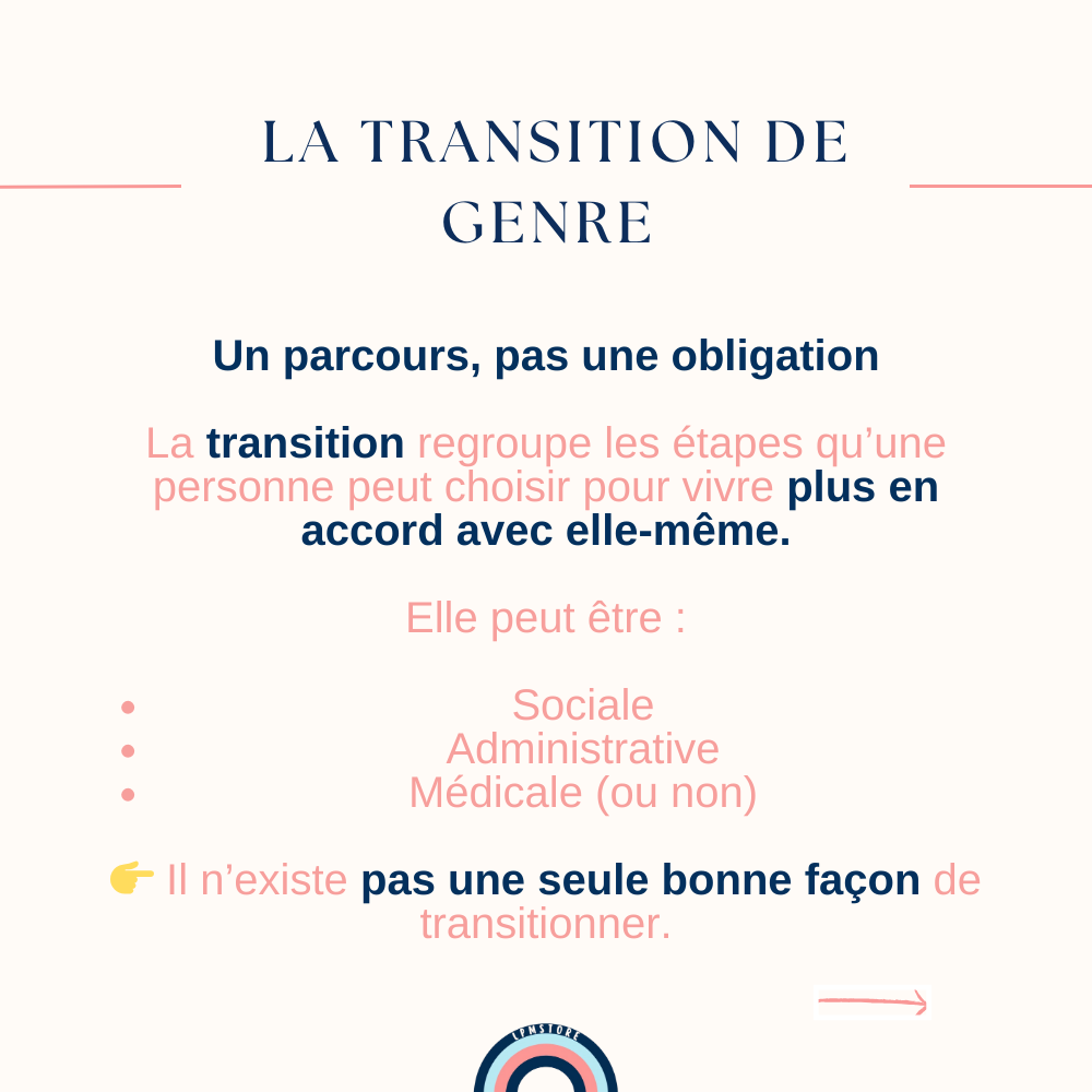 La transition de genre est l’ensemble des étapes qu’une personne peut choisir pour vivre plus en accord avec son genre.