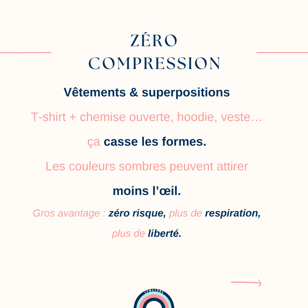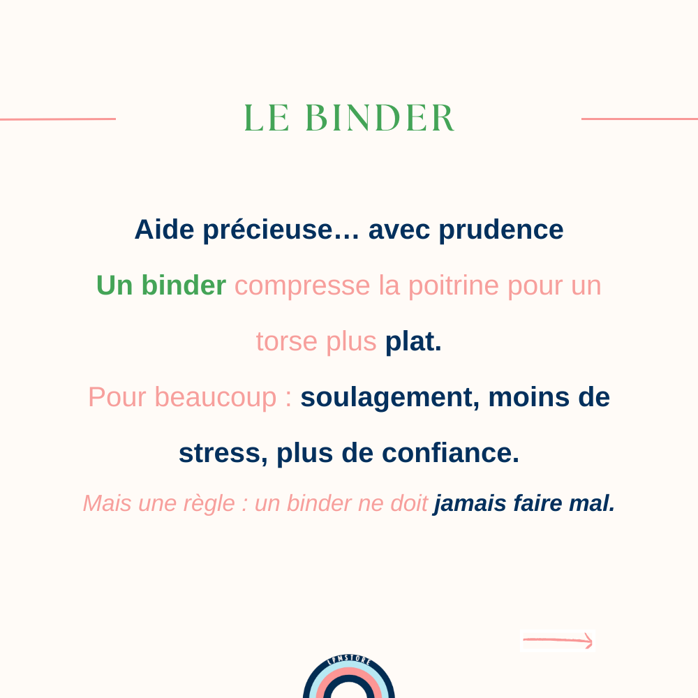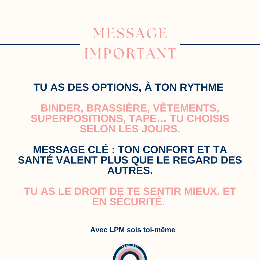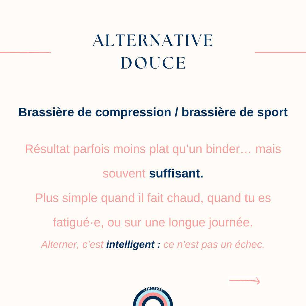 Binder, brassière de compression, vêtements, superpositions, tape… tu peux choisir la solution qui te convient, ou alterner selon les jours.