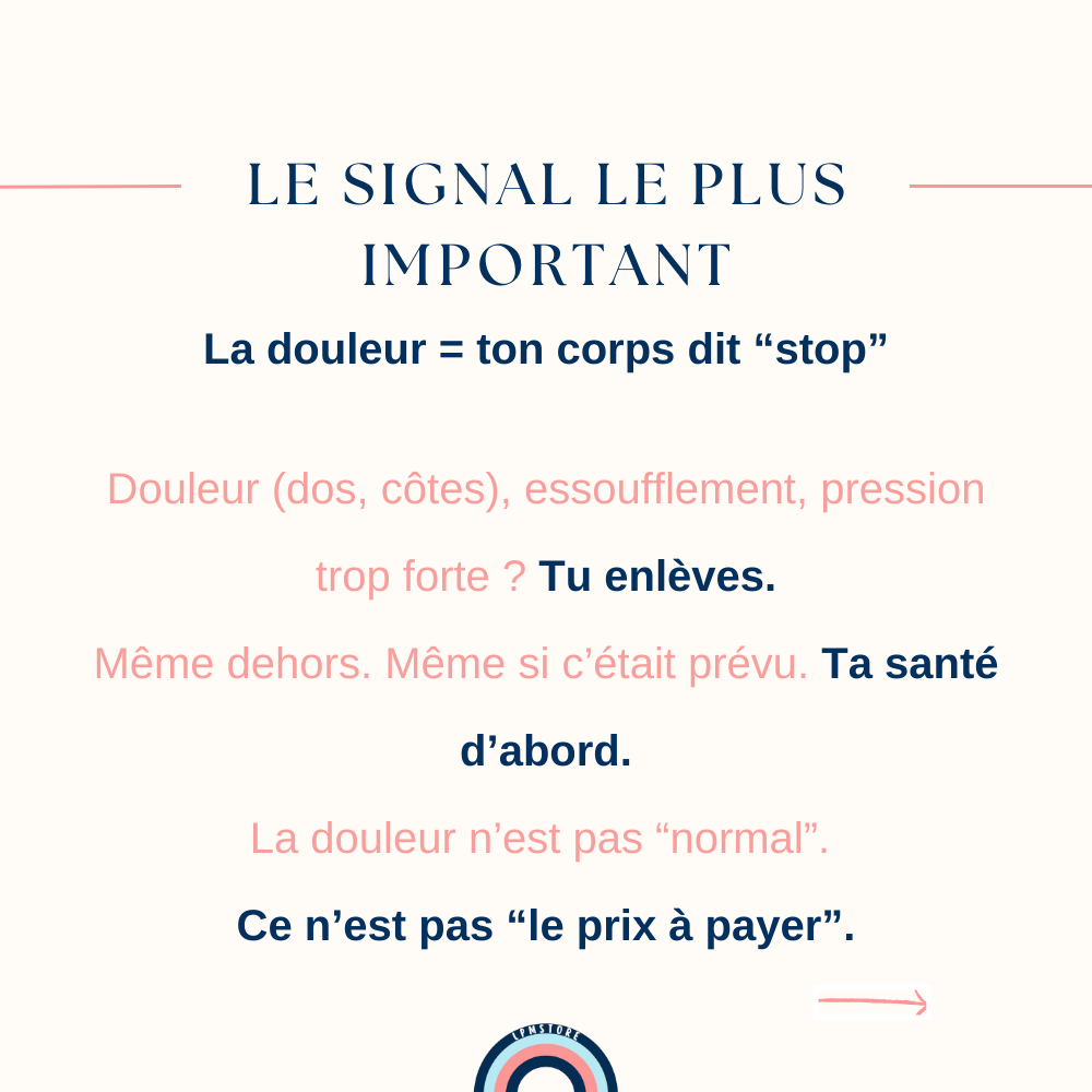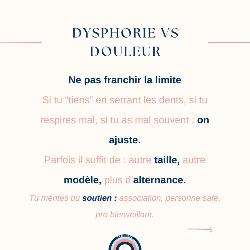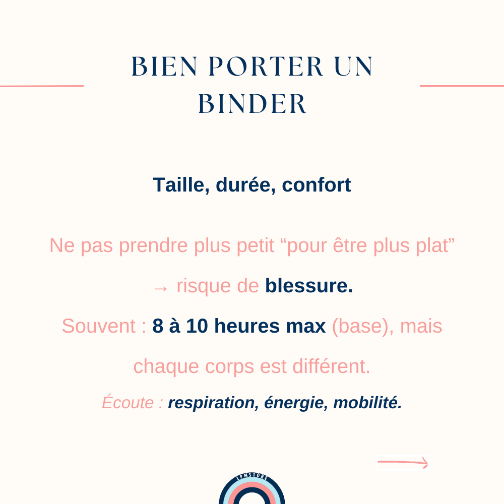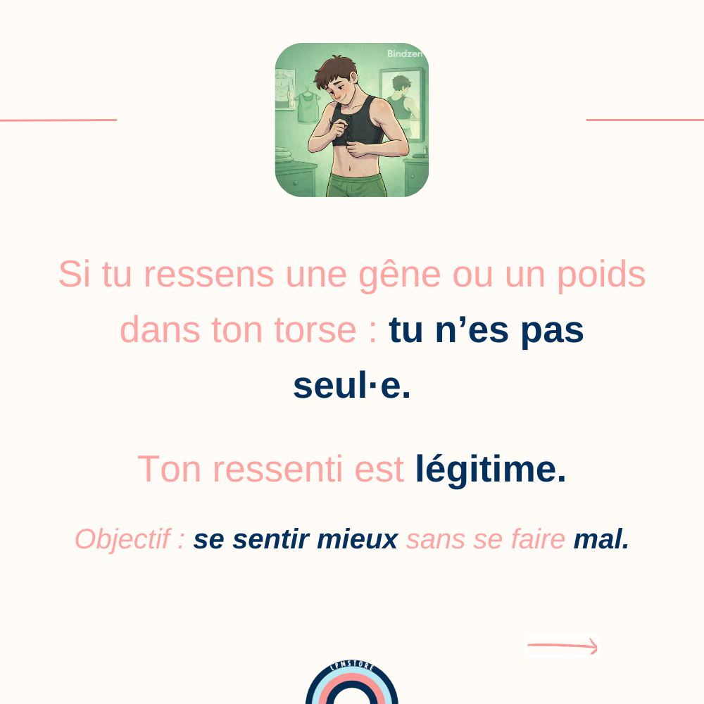 La douleur n’est pas “un passage obligé”. La douleur n’est pas un signe que “ça marche mieux”. La douleur, c’est ton corps qui te dit stop. Si tu ressens une gêne forte, un essoufflement, une douleur dans le dos, les côtes, ou une sensation de compression trop intense… enlève le binder Même si tu es dehors. Même si tu avais prévu de le garder. Ta santé passe avant tout.