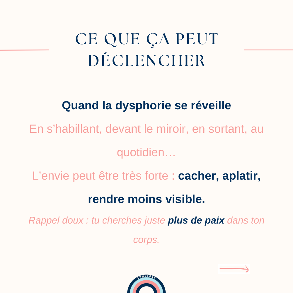La dysphorie du haut, c’est quelque chose que beaucoup de personnes connaissent. Parfois, c’est une gêne discrète. Parfois, c’est très lourd. Ça peut se réveiller en s’habillant, en se regardant dans le miroir, en sortant dehors, ou juste en sentant son torse. Et quand ça arrive, on peut avoir une envie très forte : aplatir son torse, le cacher, ou le rendre moins visible.